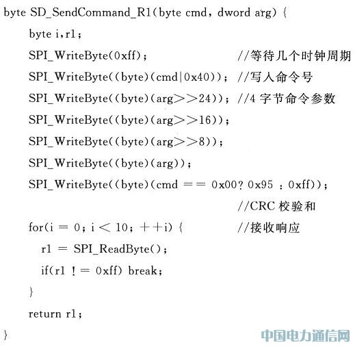 由于SD卡的命令具有統一的格式,因此可以用一個通用的寫命令函數來實現所有命令的發送。另外,考慮到多數命令的響應類型都是R1,這里的通用寫命令函數所接收的響應類型默認為R1。函數代碼如下: