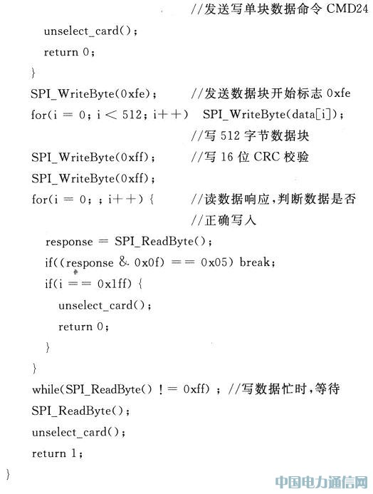 寫單塊數據的操作過程與讀操作類似,如圖5所示。拉低片選后同樣由主控制器MCF51QE128發送寫單塊數據命令CMD24,SD卡正確響應后發送數據塊開始標志0xfe,接著發送512字節數據塊和2字節CRC校驗。