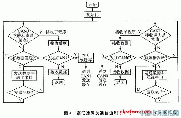 由于傳輸速率不同,高低速CAN網(wǎng)絡(luò)之間的數(shù)據(jù)傳輸是不同的。當高速CAN網(wǎng)絡(luò)數(shù)據(jù)向低速CAN傳輸時,生需要加入軟緩存暫時存儲;當?shù)退貱AN網(wǎng)絡(luò)數(shù)據(jù)向高速CAN網(wǎng)路數(shù)傳輸時,可直接傳輸。通信流程如圖4所示。