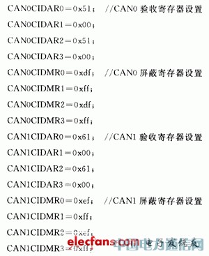 為了降低網(wǎng)絡(luò)資源的占用率,提高網(wǎng)絡(luò)通信實時性性能,在高低速CAN網(wǎng)絡(luò)之間除了必要的通信外,各自的報文是相互獨立傳輸?shù)摹_@就需要使用CAN中的標識符通過驗收過濾器進行報文過濾,可以通過對過濾器寄存器的設(shè)置實現(xiàn)這一功能。CANO與CAN4寄存器的驗收寄存器與屏蔽寄存器的設(shè)置如下: