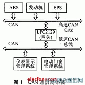 汽車的通信系統(tǒng)由EPS控制系統(tǒng)、ABS系統(tǒng)、發(fā)動機系統(tǒng)、電動車窗系統(tǒng)、車燈控制系統(tǒng)等組成。這些電控系統(tǒng)在整個控制系統(tǒng)中對響應(yīng)實時性的要求有所不同,另外汽車在實際運行過程中眾多節(jié)點之間需要進行大量的實時數(shù)據(jù)交換。若整個汽車的所有節(jié)點都掛在一個CAN網(wǎng)絡(luò)上,眾多節(jié)點通過一條CAN總線進行通信,一旦信息管理配置稍有不妥,就很容易出現(xiàn)總線負荷過大,導(dǎo)致系統(tǒng)實時響應(yīng)速度下降的情況。這在實時系統(tǒng)中是不允許的,因此根據(jù)不同的要求,可將汽車網(wǎng)絡(luò)分為高速CAN網(wǎng)絡(luò)和低速CAN網(wǎng)絡(luò)兩個速率等級。ABS、EPS等節(jié)點電控單元個數(shù)少,實時性和穩(wěn)定性要求高,組成傳輸速率為500 kbps的高速CAN網(wǎng)絡(luò)。眾多的車身電機和車燈節(jié)點電控單元數(shù)量多,傳輸?shù)臄?shù)據(jù)紛繁復(fù)雜,對準確性、穩(wěn)定性的要求勝于實時性,組成傳輸速率為125 kbps的低速CAN網(wǎng)絡(luò)。對于不同速率網(wǎng)絡(luò)之間的通信,必須有相應(yīng)的網(wǎng)關(guān)進行數(shù)據(jù)過濾和速率轉(zhuǎn)換,以實現(xiàn)不同速率網(wǎng)絡(luò)節(jié)點之間的數(shù)據(jù)通信。高低速CAN 網(wǎng)關(guān)用LPC2129實現(xiàn),其通信網(wǎng)絡(luò)如圖1所示。