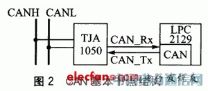 CAN節(jié)點硬件電路主要包括帶有CAN控制器的微控制器和用于數(shù)據(jù)收發(fā)的CAN收發(fā)器。本設(shè)計使用的是NXP公司的32位微控制器LPC2129,它帶有 CAN控制器,主要負責CAN的初始化和數(shù)據(jù)處理。CAN收發(fā)器種類有很多,本設(shè)計使用Philips公司的CAN高速收發(fā)器TJAl050。CAN基本節(jié)點結(jié)構(gòu)如圖2所示。