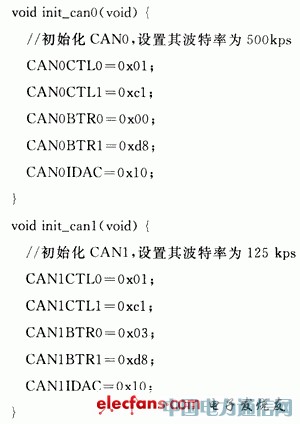 網(wǎng)關(guān)軟件設(shè)計部分主要實現(xiàn)的功能是各節(jié)點的數(shù)據(jù)收發(fā),特別是網(wǎng)關(guān)可以實現(xiàn)高低速網(wǎng)絡(luò)數(shù)據(jù)的轉(zhuǎn)換。對實時性要求不高的車燈控制和車窗控制電路采用低速CAN 網(wǎng)絡(luò),波特率為125 kbps;對實時性要求較高的ABS系統(tǒng)和EPS系統(tǒng)等采用高速CAN網(wǎng)絡(luò),波特率為500 kbps。