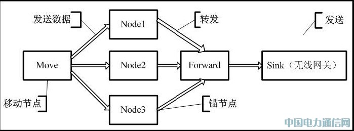 底層模塊通過Move 節點發送數據到Node1,Node2,Node3 節點,Node1,Node2,Node3節點分別從Move 節點中取出RSSI 值并將這些值連同自身的SOURECE_ADDRESS 值封裝到數據字段并通過Forward 節點轉發給Sink 無線網關節點。底層模塊結構如圖8 所示: