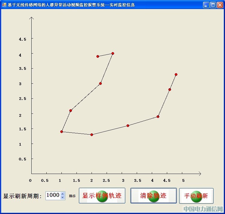 實時監控模塊:該模塊主要負責將無線傳感網絡中移動節點的軌跡信息實時顯示在監控畫面當中;用戶通過點擊顯示樣例軌跡了解軌跡的概念;通過清除軌跡操作清除屏幕上的所有軌跡信息;此外,用戶可以通過調整顯示刷新周期,對軌跡數據的動態刷新周期進行設置;如果刷新周期設置過長,則通過手動刷新按鈕刷新軌跡以實時觀察移動節點的估計信息。