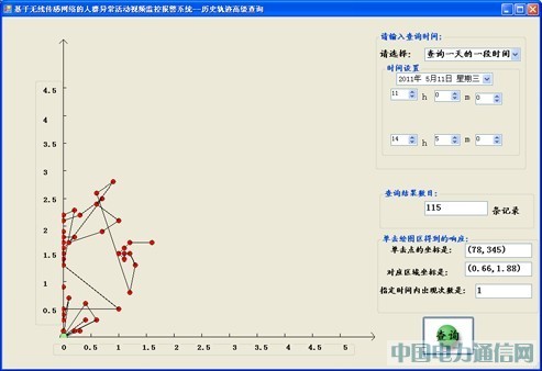 歷史數據查詢模塊:該模塊主要負責歷史數據的查詢功能,模塊包括人員位置/軌跡一般查詢、人員位置/軌跡高級查詢、歷史警報信息查詢三大功能。其中,人員位置/軌跡高級查詢,主要根據用戶輸入的時間段信息查詢人員的軌跡信息,用戶根據需求查詢一天、一天的一段時間、幾天、幾天的一段時間或者是一個精確時刻的軌跡信息。此外,該部分還提供了一些其他功能,如用戶在顯示軌跡區域單擊一個點,該單擊點的在繪圖區域的坐標、該坐標對應的實際區域中的坐標及查詢人員在該實際坐標出現的次數都將被列出來顯示。歷史數據查詢模塊的另外一個重要功能就是歷史警報信息的查詢功能。該功能允許用戶查看所有的警報信息,即被監測人員所出現的所有非安全區域的信息。此外,系統提供用戶根據需要刪除部分選定的警報信息的功能。