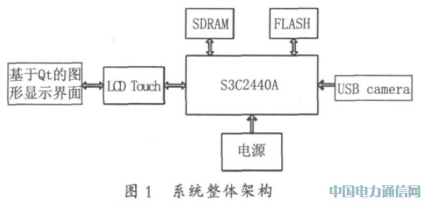 系統(tǒng)通過當前市場上應用最廣泛的中芯微公司生產(chǎn)的zc301p 芯片的USB 攝像頭進行圖像采集,然后將圖像信息傳送到ARM 芯片中進行處理,最終通過基于Qt/Embedded 編寫的圖形顯示程序在LCD 上實時顯示。系統(tǒng)的整體架構如圖1 所示。
