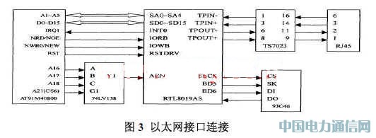 模塊選用的網絡接口芯片是 Realte公司的 RTL8201BL。它是具有 lOM/100Mps自適應功能的以太網收發控制器,是目前應用最為廣泛的一種網絡接口芯片。系統將壓縮后的音視頻數據打包,通過網絡接口發送到網絡中,其電路圖如圖 3所示。