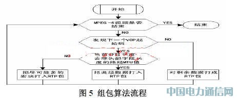 2 VOP分段,放入多個 RTP包,此時須把 VOP頭部信息復制到每個 RTP包,以去除包間的相關性,達到丟包的魯棒性 :為減小包數,降低開銷,一包中能放入多少宏塊就盡可能多地放入多少宏塊,但即使最后一個包中仍有剩余空間,也小能把另一 VOP中的宏塊放入此包中,算法流程如圖 5所示。