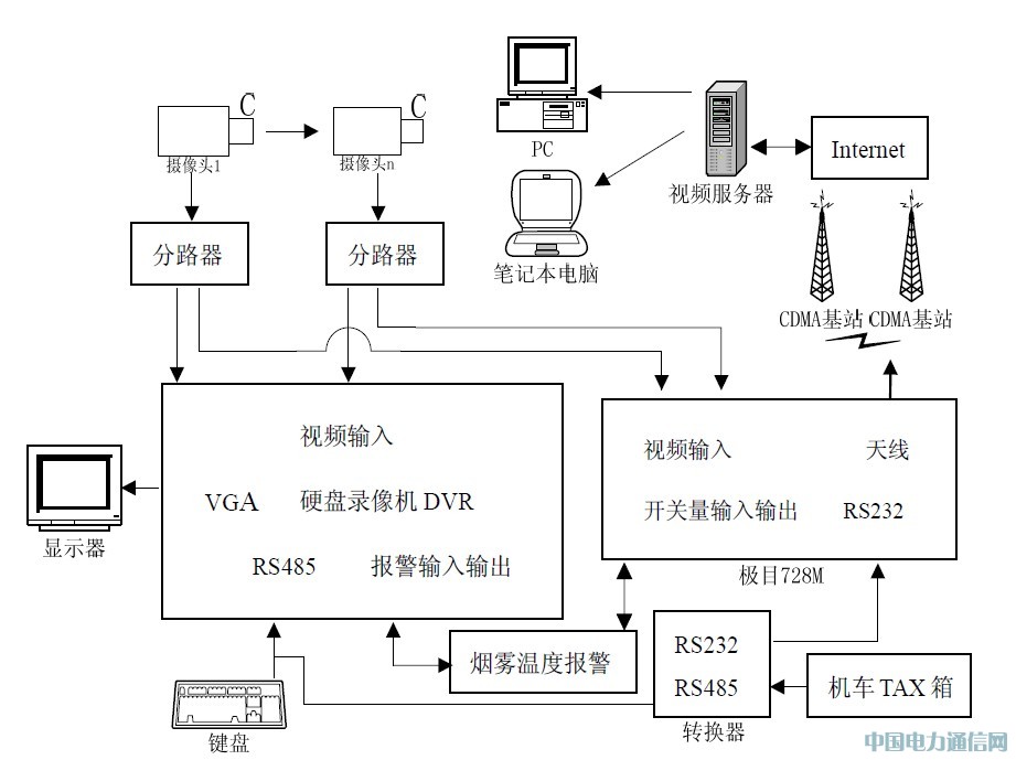 硬盤錄像機(jī)選用了深圳景陽公司的ADR 系列嵌入式數(shù)字硬盤錄像機(jī),它采用工業(yè)級專用數(shù)字信號處理器和嵌入式操作系統(tǒng)(Vxworks),可靠、穩(wěn)定。它支持16 路視頻輸入,司機(jī)在駕駛室可通過RS485 接口接盤選擇1 路或者多路觀看。同時,它還支持多路報警量輸入,可在機(jī)車關(guān)鍵部位安裝溫度、煙霧傳感器,并接入硬盤錄像機(jī)對應(yīng)接口,在機(jī)車出現(xiàn)溫度、煙霧異常情況時,硬盤錄像機(jī)可發(fā)出警報,提醒司機(jī)注意。
