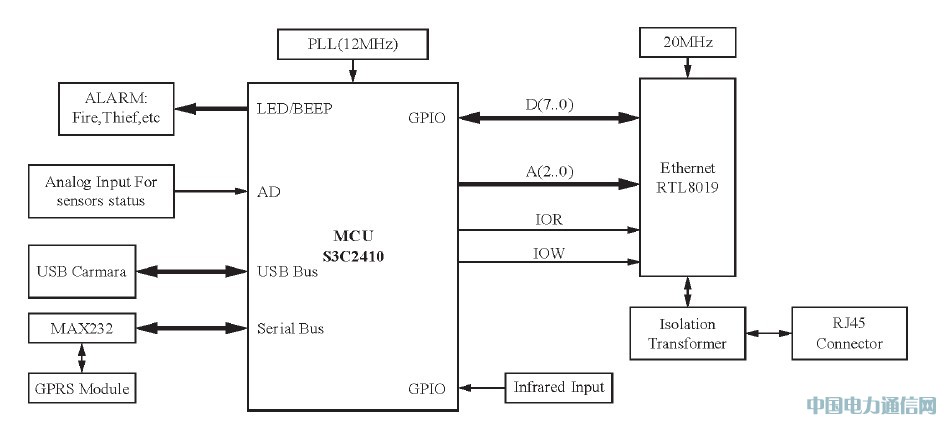 網絡接入系統一般有兩種設計方式, 一是通過外部擴展網絡芯片RTL8019AS來實現, 另一種是通過外部擴展的GPRS模塊(設計中, GPRS核心模塊可采用wavecomQ2403A) 來實現。前者適合應用在檢測地點固定的情況下, 而后一種方式既能提供事件觸發短信發送功能, 又可以提供GPRS網絡接入功能, 從而使得視頻監控系統在汽車、野外現場等環境中也能夠得到應用。