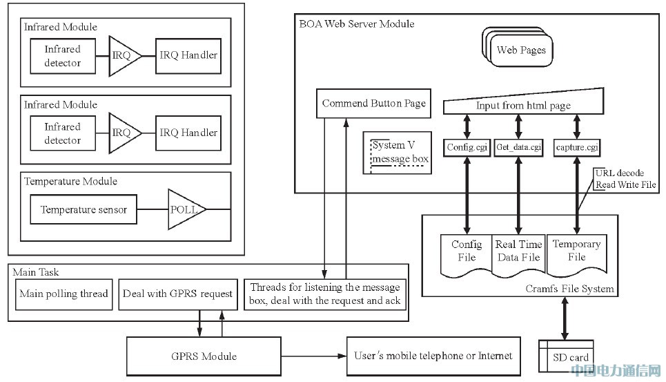 本系統軟件由后臺進程和前臺用戶接口兩部分組成。為了防止競態的出現, 在軟件實現時,用戶CGI接口可利用system V的郵箱通信機制向后臺進程提出請求。后臺開設有線程接收請求并對各設備功能模塊進行統一調度。圖2所示是本系統的軟件整體結構框架。下面分別對系統的各個模塊進行介紹。