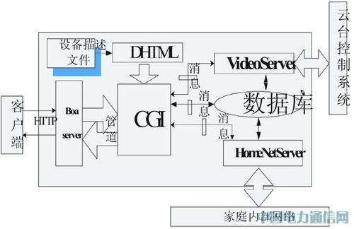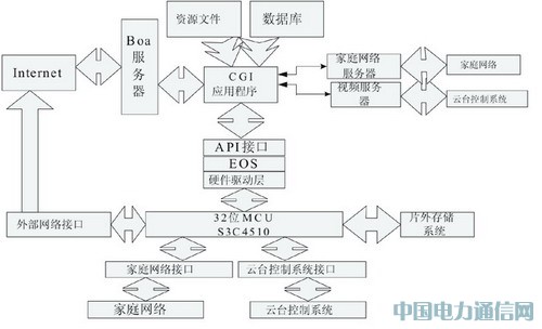 本系統的特點是基于嵌入式微處理器有限的系統資源之上,為客戶提供視頻服務。本系統采用的是"boa服務器+CGI+家庭網絡服務器"的模式來實現對信息家電的控制。以及采用了"boa服務器+CGI+視頻接收和控制模塊(視頻服務器)"的模式實現對視頻數據的捕獲、采集、發送等操作,并通過串行口通信方式對云臺和鏡頭進行直接的控制,視頻的接收問題一直以來是研究的重點,本系統采用在WEB頁面中嵌入ActiveX控件的方式,由ActiveX控件完成視頻數據的接收、解碼和顯示工作。這樣做的好處是,不需對客戶端做任何設置,就可以完成控件的自動下載和視頻文件的實時播放。