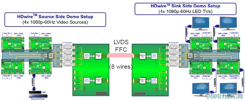 bps的原始頻寬(多芯片結構可擴充至60Gbps),提供比其它任何競爭者更多的產量。在同類型技術中,反向影像資料信道是一個獨特的特色,讓HDwire增添更多產品價值。使用嵌入式時脈,不需要在接收器中使用振動器,所有纜線中的排線都用來傳輸資料,因此可減低傳輸的固定成本并簡化接收器時脈結構。