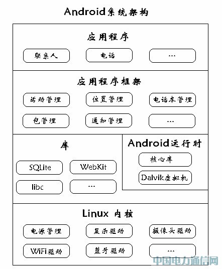 Android 系統架構見圖3,它建立于Linux內核之上,包含了各種設備驅動和管理模塊,囊括了非常齊全的類庫和框架,包括輕量級數據庫SQLite、瀏覽器Webkit 等。整個系統建立在Dalvik 虛擬機上,應用程序使用Java 語言編寫。Android 系統提供了豐富的框架(活動管理、位置管理等)來管理系統的軟、硬件資源,整合了常用的應用程序(聯系人、電話本等),并開放了很全面的API 供用戶使用,整個平臺具有良好的開放性和擴展性。