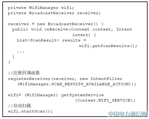 參見圖5 示例代碼片段。首先建立包含響應掃描結果的接收器(reciever) 并重載onReceive()方法,此方法即為收到WiFi 信號的回調函數,用戶自定義功能在此實現;再通過registerReceiver()方法將receiver 向Android 系統進行注冊,getSystemService()方法用于獲得操作WiFi 設備的句柄;最后用startScan()方法啟動掃描,當獲得掃描結果后,系統會觸發注冊的回調函數,完成用戶代碼功能。