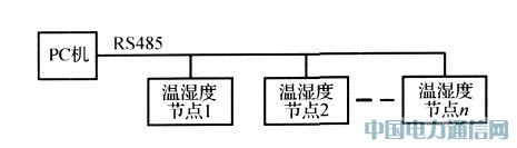 傳統的圖書館藏書溫濕度監控系統的構成如圖2所示。優點是傳輸距離較遠,可靠性較高;缺點是布線困難,增加節點軟硬件都需要重新設置。