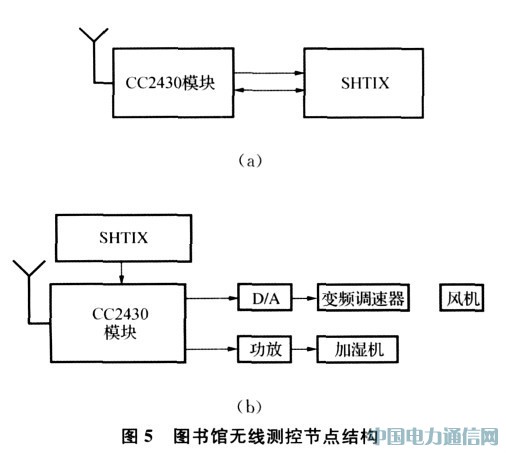 圖書館無線節點分別為測量節點和測量控制節點,如圖5(a)、(b)所示。各書庫中傳感器測量出溫濕度值,送給網絡協調器,網絡協調器將對測量進行分析,如果超越溫濕度允許值范圍,則通過網絡中無線節點的控制節點啟動變頻調速控制空調或加濕機。