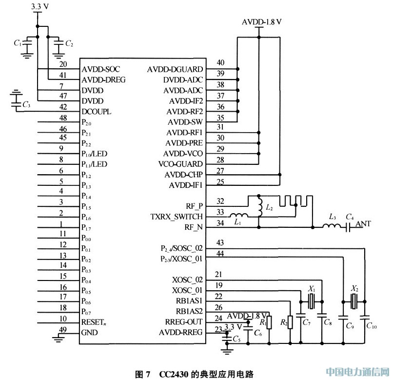 2)典型應用電路。CC2430的典型應用電路如圖7所示。