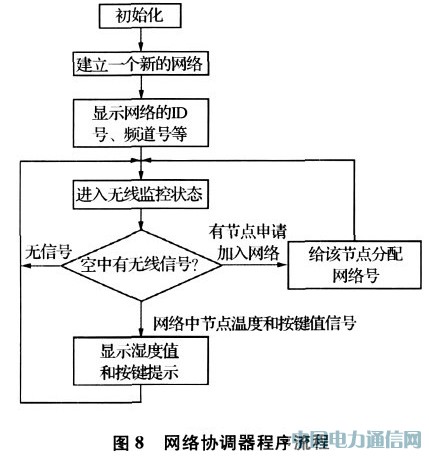 CC2430的Zigbee協議棧中定義了3種設備:節點(End device)、路由器(Router)和協調器(Coordinator)。其中:Coordinator節點發起網絡,等待Enddevice或Router節點加入。Enddievice只能作為采集和接受數據葉子節點加入網絡,不具備數據轉發的能力。Router節點的程序基本功能和Enddevice一樣,Router作為Router或Enddevice的父節點,可以轉發數據。Zigbee協議支持的網絡結構有星狀、樹狀和Mesh網絡結構。溫濕度數據采集與控制采用的是Router設備。與后臺計算機相連的是Coordinator節點。