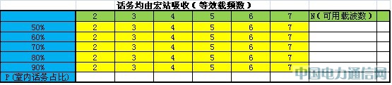 表一:單宏扇區話務容量(等效載頻數)與載頻數和室內話務占比的數值分析結果