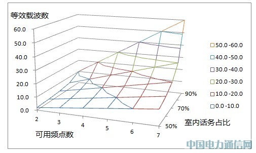 該曲線族可以看出,由于全面采用宏小區覆蓋,作為容量特征的等效載波數,與室內話務占比無關,與可用頻點數呈線性增長關系,該結果可作為同/異構網絡的容量基線。
