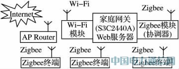 Zigbee 作為一種新興的無線通信技術(shù),其低速率、低成本、低功耗、自配置和靈活的網(wǎng)絡(luò)結(jié)構(gòu),非常適合于家庭內(nèi)部組網(wǎng)。而Wi-Fi 作為一種無線聯(lián)網(wǎng)技術(shù),最主要的優(yōu)勢在于不需要布線,不受布線條件的限制,因此特別適合移動辦公用戶的需要,在智能家居中采用Wi-Fi 技術(shù)使得家庭內(nèi)部網(wǎng)絡(luò)與Internet 連接更加便捷,通過一臺Wi-Fi 的手持終端設(shè)備就可以直接進入家庭網(wǎng)關(guān),實現(xiàn)對家電設(shè)備的遠程監(jiān)控和智能控制。系統(tǒng)中家庭網(wǎng)關(guān)為Wi-Fi-ZigBee 的Web 服務(wù)器,它是ZigBee 協(xié)議、Wi-Fi 協(xié)議和以太網(wǎng)之間的轉(zhuǎn)換接口,并負責(zé)建立和管理無線傳感器網(wǎng)絡(luò)以及實現(xiàn)外網(wǎng)的通信連接。