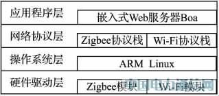 家庭網(wǎng)關(guān)采用模塊化設(shè)計方案,如圖4 所示由硬件驅(qū)動層、操作系統(tǒng)層、網(wǎng)絡(luò)協(xié)議層和應(yīng)用程序?qū)咏M成。硬件驅(qū)動層描述網(wǎng)關(guān)節(jié)點中Zigbee 模塊和Wi-Fi 模塊的驅(qū)動; 操作系統(tǒng)層移植了ARM Linux 實時操作系統(tǒng)內(nèi)核; 網(wǎng)絡(luò)協(xié)議層移植了Zigbee 和Wi-Fi 協(xié)議棧,實現(xiàn)Zigbee 和Wi-Fi 協(xié)議雙向轉(zhuǎn)換;應(yīng)用程序?qū)釉贚inux 內(nèi)核上移植嵌入式Web 服務(wù)器軟件Boa.