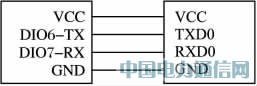 該模塊與S3C2440A 中的UART1 相連,S3C2440A 中有三個通用異步串行接口,UART0 是RS232 接口,用來連接PC 機,UART1 和UART2 是TTL 接口。這里使用UART0 來連接,設(shè)置相應(yīng)波特率后實現(xiàn)數(shù)據(jù)傳輸。其通信接口電路如圖3 所示,只需連接TXD0 和RXD0 兩根信號線即可實現(xiàn)兩者的數(shù)據(jù)傳輸通信。