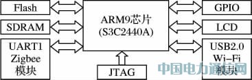控制器是整個嵌入式家庭網(wǎng)關(guān)的核心,用來對Zigbee 通信模塊進行相應(yīng)配置并接收Zigbee 終端節(jié)點的數(shù)據(jù),利用Wi-Fi 協(xié)議將網(wǎng)關(guān)通過Wi-Fi 模塊連接到Internet 網(wǎng)絡(luò)。為了能達到高性能、低功耗的目的,設(shè)計的嵌入式網(wǎng)關(guān)采用以ARM920T 為核心的32 位的RISC 微處理器S3C2440A 作為主控制器,該處理器集成了LCD 控制器、USBHost、NAND 控制器、BUS 控制器、中斷控制、功率控制、存儲控制、UART、SPI和GPIO 等豐富的外圍資源,通過外擴存儲器、串口、USB接口和JTAG 調(diào)試接口等構(gòu)成硬件平臺。