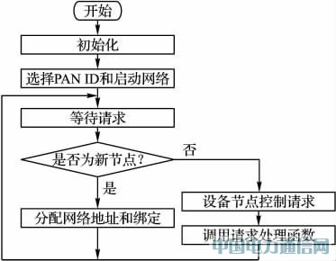 在智能家居內(nèi)部ZigBee 無線網(wǎng)絡(luò)中,首先協(xié)調(diào)器進行初始化,然后協(xié)調(diào)器選擇一個稱為PAN ID 的標識號碼,接著啟動網(wǎng)絡(luò),所有的設(shè)備接入CSMA-CA 機制的協(xié)調(diào)器。當(dāng)協(xié)調(diào)器收到數(shù)據(jù)時,首先判斷是新節(jié)點加入網(wǎng)絡(luò)的請求還是設(shè)備節(jié)點的控制請求: 如果是新節(jié)點加入網(wǎng)絡(luò)的請求則分配網(wǎng)絡(luò)地址并綁定節(jié)點; 如果是控制請求,則調(diào)用控制請求處理函數(shù)處理數(shù)據(jù)。數(shù)據(jù)處理完畢,協(xié)調(diào)器返回等待請求監(jiān)聽狀態(tài)。