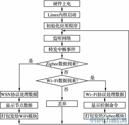 家庭網(wǎng)關(guān)主程序處理流程如圖7 所示。硬件上電系統(tǒng)啟動以后,應(yīng)用程序初始化,網(wǎng)關(guān)開始監(jiān)聽網(wǎng)絡(luò),有數(shù)據(jù)到來網(wǎng)關(guān)進入中斷狀態(tài)。首先判斷是否Zigbee 數(shù)據(jù),如果是Zigbee數(shù)據(jù),按照WSN 協(xié)議處理數(shù)據(jù)然后打包轉(zhuǎn)發(fā)給Wi-Fi 模塊,網(wǎng)關(guān)返回監(jiān)聽狀態(tài); 如果不是Zigbee 數(shù)據(jù),網(wǎng)關(guān)判斷是否Wi-Fi 數(shù)據(jù),如果是則以Wi-Fi 協(xié)議處理數(shù)據(jù)然后打包轉(zhuǎn)發(fā)給Zigbee 模塊,并返回監(jiān)聽狀態(tài); 若是未知數(shù)據(jù),網(wǎng)關(guān)進行丟棄處理直接返回監(jiān)聽網(wǎng)絡(luò)狀態(tài)。