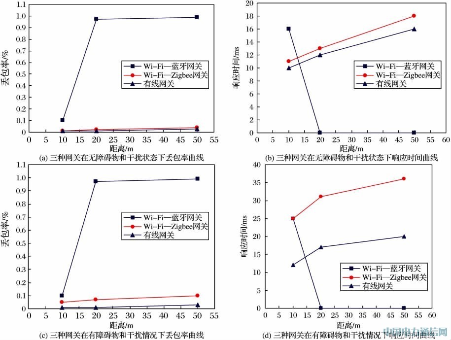 為驗證Wi-Fi-Zigbee 網(wǎng)關(guān)在智能家居監(jiān)控系統(tǒng)中的性能,測試了兩組性能指標: 1) 無障礙物和干擾狀態(tài)下,隨著距離的增加,數(shù)據(jù)丟包率和響應(yīng)時間的變化情況; 2) 數(shù)據(jù)傳輸距離分別為10 m、20 m、50 m 時,有障礙物情況下丟包率和響應(yīng)時間性能變化; 如圖8 所示,其中( a) 、( b)為在無障礙物和干擾狀態(tài)下測得三種網(wǎng)關(guān)下丟包率與響應(yīng)時間的曲線:(c) 、(d)為在有障礙物和干擾情況下所測得的數(shù)據(jù)。實驗結(jié)果表明,在無障礙物傳輸距離為50 m 以內(nèi)時,Wi-Fi-Zigbee 網(wǎng)關(guān)較Wi-Fi-藍牙網(wǎng)關(guān)的優(yōu)勢明顯,隨著傳輸距離增加,丟包率低維持在3% 左右,相對于有線網(wǎng)關(guān)高出2% 左右,而響應(yīng)時間波動在1 ms 以內(nèi),完全能夠充分滿足正常家居環(huán)境的通信需要,而且接收功率很低,非常適合家庭的使用。在有障礙物和干擾的情況下,Wi-Fi-Zigbee 網(wǎng)關(guān)丟包率與響應(yīng)時間較有線網(wǎng)關(guān)稍高,卻遠優(yōu)于Wi-Fi-藍牙網(wǎng)關(guān)。
