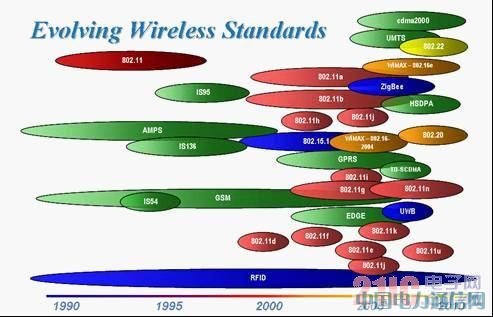 同時,各種無線通信標準的不斷涌入也同樣使人感到束手無策,每個公司和組織都在根據自己特定應用的需求來制定和優化不同的標準和協議,這就使得大 量的新標準如雨后春筍般出現,而每個標準的生命周期卻被大大的縮短。如果通過時間軸來顯示各種標準,許多標準的演化過程會變得十分清晰,而新標準的開發也 正以前所未有的速度進行著。如下圖所示,在2000年之前,并存的標準只有四五種,并且生命力較長,到今天,這種情況已被層出不窮的各種標準所顛覆。