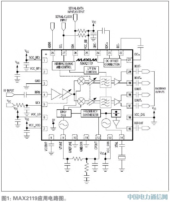 MAX2119外圍僅需要一個晶體以及少量的電阻電容就可以組成一個完整ABS-S接收前端。可直接將ABS-S信號下變頻到解調芯片所需要的I/Q信號。RF輸入頻率范圍為950MHz至2150MHz,覆蓋目前直播星的950MHz至1450MHz的主要工作頻段。晶體的參考頻率為12MHz至30MHz。