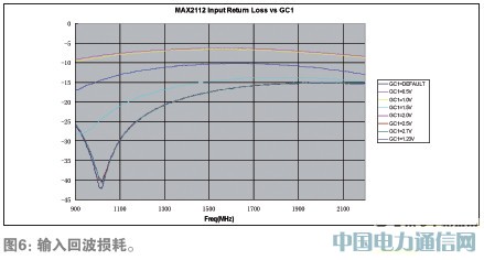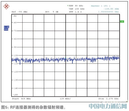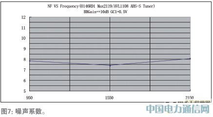 圖5、圖6、圖7分別給出了雜散輻射、輸入回波損耗和噪聲系數指標的測試結果,圖5所示雜散輻射低于-102dBm;圖6所示輸入回波損耗在950MHz-2150MHz段低于-6.2dB;圖7所示為950MHz到2150MHz頻段內的噪聲系數,950MHz為7.85dB,2150MHz為8.07dB。基帶增益設置為+10dB。