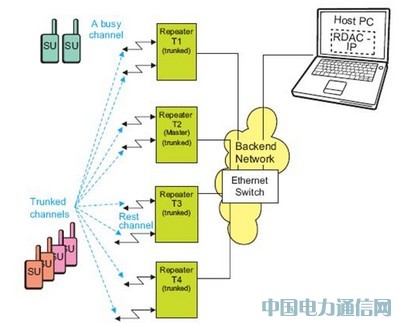 本工程采用的MOTOTRBO Capacity Plus系統(tǒng)可以滿足大容量語音和數(shù)據(jù)通信需求。在智能信道共享模式下,所有的對講機共享中繼臺集群的所有信道。由6臺中繼臺組成的12個邏輯信道的共享信道池,在同一時刻,所有的信道都在被使用的情況是很少的,因此相對于每個對講機使用一個固定的信道的情況,智能信道共享系統(tǒng)更少被阻塞。帶有本地RDAC(中繼臺診斷和控制)的智能信道共享系統(tǒng)圖如下: