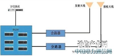 本工程規(guī)劃使用6臺XiR R8200數(shù)字中繼臺,通過6根網(wǎng)線與交換機連接,構(gòu)成12個邏輯信道池。通過合路器將發(fā)信端合路,分路器將收信端分路,室內(nèi)天線、室外天線分為兩路分別完成發(fā)射和接收信號。