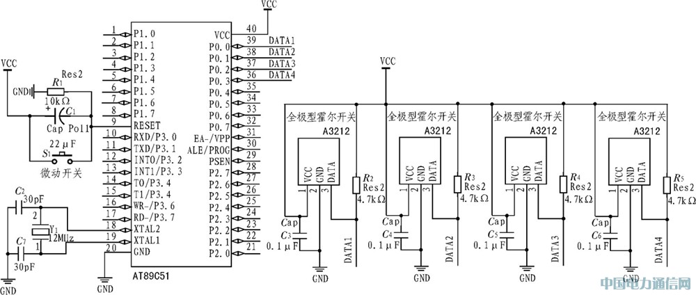傳感器使用的是4個低功耗、高靈敏度A3212全極霍爾效應數字傳感器,它是美國AllegroMicrosystems公司生產的一種霍爾開關型傳感器,它具有工作電壓低,數字鎖存輸出等特點。它與其他霍爾效應開關不同,只要存在強度足夠大的北極或南極磁場,這些器件就能打開不需要接觸,而在沒有磁場的時候,輸出會關閉,具有結構牢固,體積小,重量輕,壽命長,安裝方便,功耗小,頻率高(可達1 MHz),耐震動,不怕灰塵等優點。圖2為全極霍爾效應數字傳感器和AT89C51的鏈接原理圖。