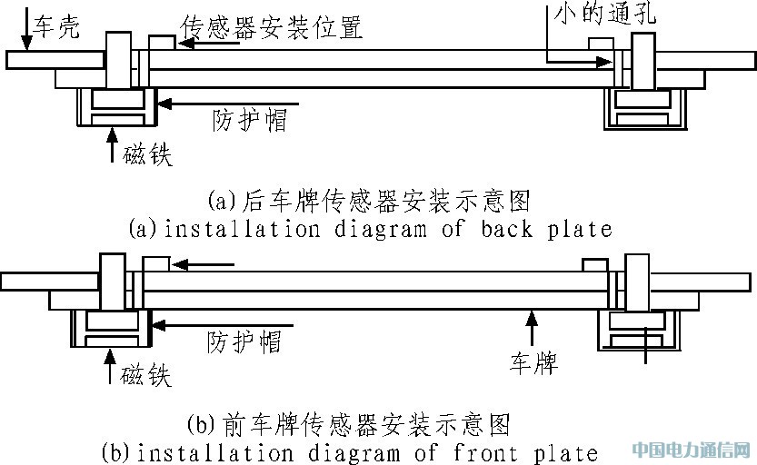在圖4中,螺絲防護帽中粘貼上一個磁鐵,然后在車殼里面裝上傳感器,由于前車牌安裝的部位是非鐵磁性材料,后車牌安裝的部位有的是鐵磁性材料,有的是非鐵磁性材料。如果后車牌安裝位置是鐵磁性材料,為了傳感器能檢測到磁信號,在后面車殼上鉆一個小的通孔來保證此信號能被傳感器檢測,如圖3(a)所示,如果是非鐵磁性材料安裝如圖3(b)所示。