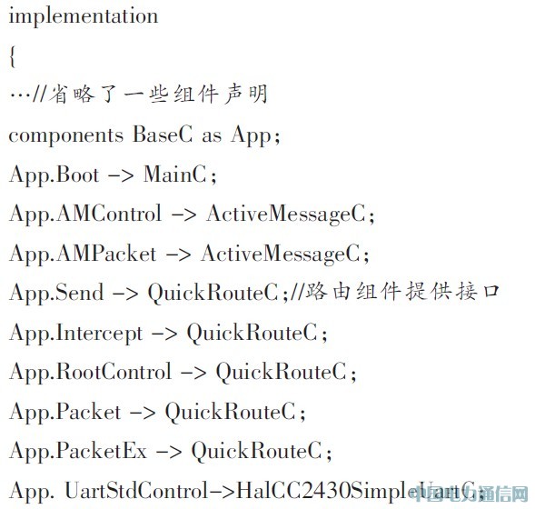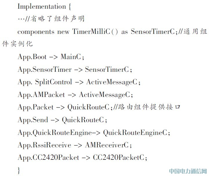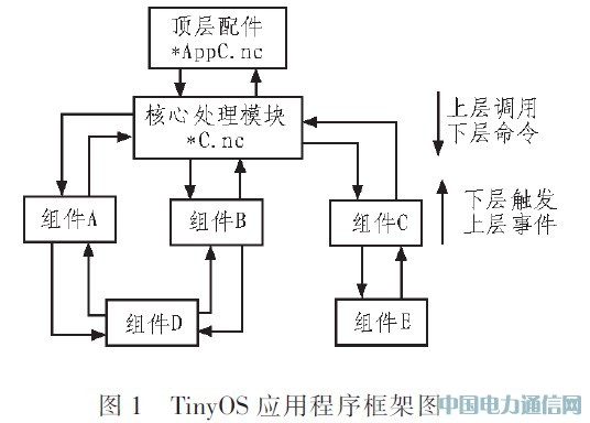 TinyOS應用程序通常由頂層配件、核心處理模塊和其它組件構成。每個應用程序有且僅有一個頂層配件,組件間通過接口進行連接通信,下層組件提供接口,通過provideinterface interfaceName來聲明,上層組件使用接口,通過useinterface interfaceName來聲明。接口提供兩類函數,分別是命令(command)函數與事件(event)函數,上層組件向下層組件發出命令,啟動下層組件的功能:下層組件完成相應的功能后向上層組件報告事件。應用程序總體框架如圖1所示。
