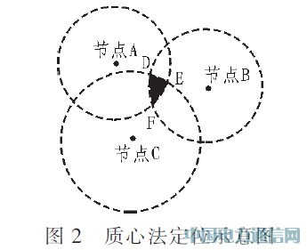 本文在RSSI定位基礎上使用質心算法提高定位精度,如圖2所示,最后求得的盲節點坐標為點D、E和F組成的三角形的質心。