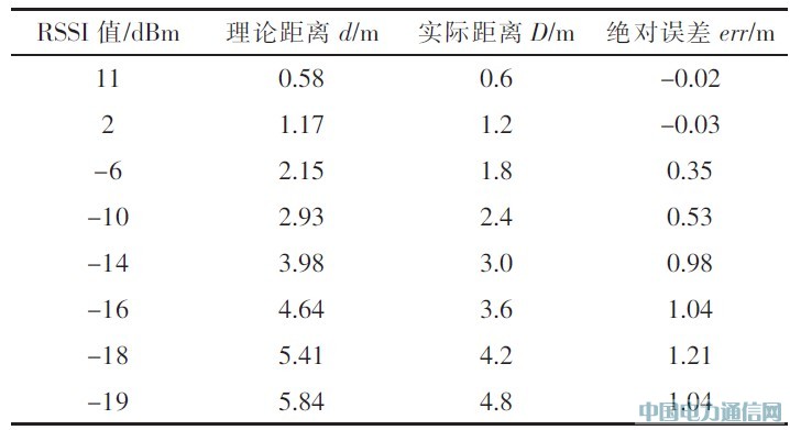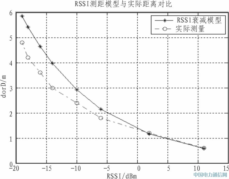 在確定PC機能夠正確接收各錨節點的RSSI值后,還需要選取合適的RSSI測距信號衰減模型,將RSSI值轉化為距離。本實驗中采用在無線信號傳輸中應用廣泛的對數--常態模型,如式(1)所示: