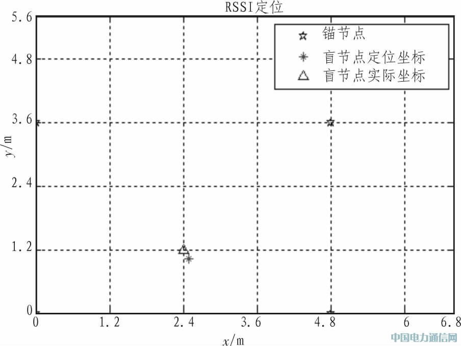 本文在TinyOS操作系統下實現了基于CC2430模塊的RSSI定位,分析了盲節點、錨節點和匯聚節點的工作流程,確定了實驗室條件下無線傳輸模型Shadowing模型參數,最后利用Matlab計算出盲節點坐標。定位結果顯示,通過定位算法所得的盲節點坐標與實際坐標誤差為0.199 6 m,可滿足大多數無線傳感器網絡對節點定位的要求。