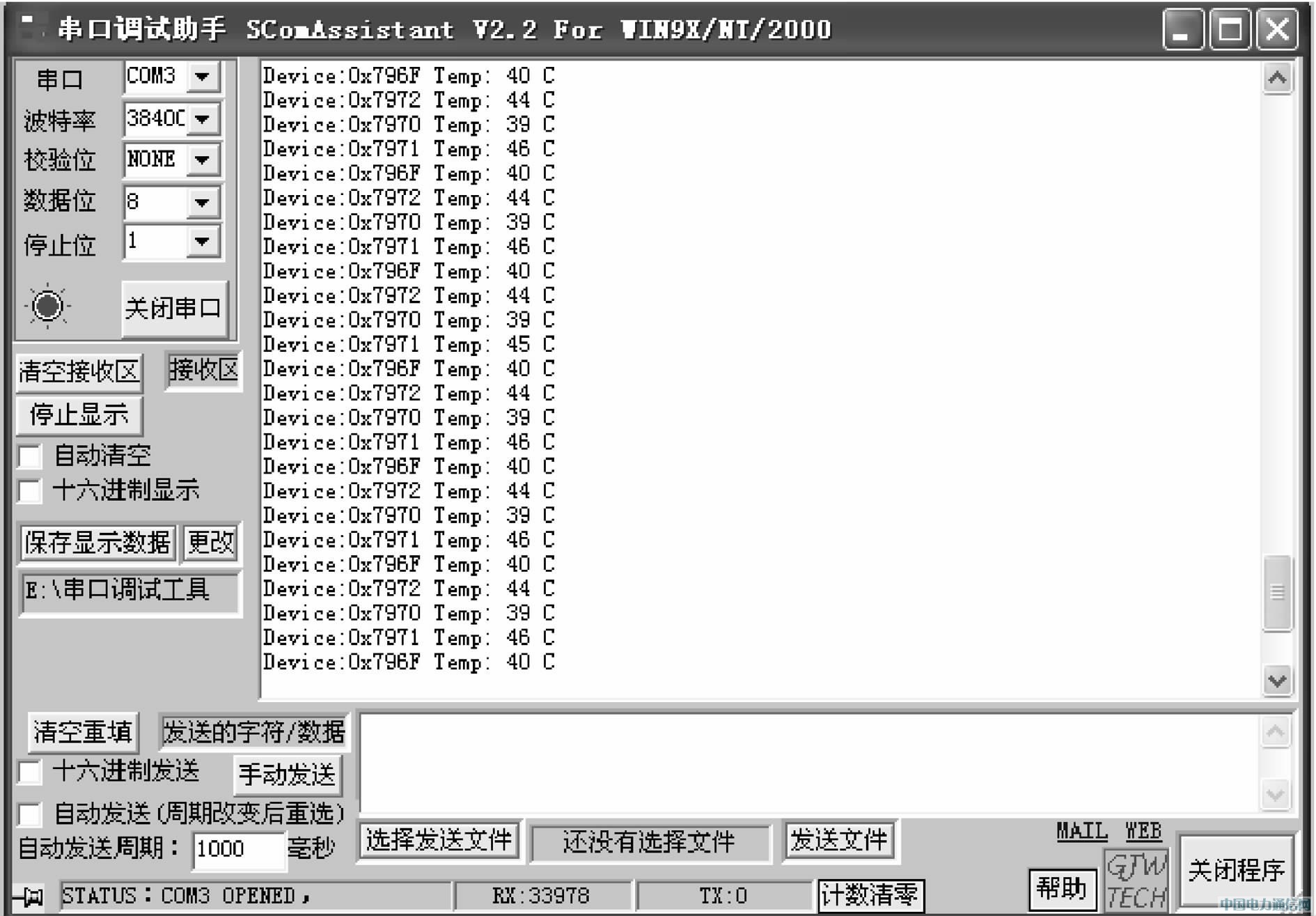 當(dāng)協(xié)調(diào)器接收到溫度信息之后,對(duì)其進(jìn)行解析,得到溫度信息。通過調(diào)用串口通信程序,將數(shù)據(jù)發(fā)送給PC機(jī)進(jìn)行顯示。串口通信程序的設(shè)計(jì),這里也不再詳述。