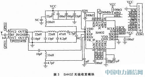 為了達到較好的通信效果,Si4432的接收低噪聲放大器匹配電路和發(fā)射功率放大器匹配電路的阻容參數(shù),應嚴格按照數(shù)據(jù)手冊提供的參數(shù)選型。前端的分集式電路采用UPG2214TB,其VC1腳和VC2腳分別連接Si4432的GPIO1和GPIO2.通過這款交叉開關實現(xiàn)分集式天線發(fā)送和接收通道的自動切換。
