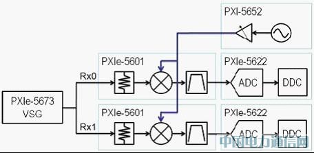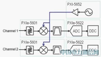 在圖 3 中可看到 PXIe-5663 - RF 向量訊號(hào)分析器是由 PXI-5652 連續(xù)波合成器、PXIe-5601 - RF 降轉(zhuǎn)換器,與 PXIe-5622 - IF 示波器所構(gòu)成。當(dāng)向量訊號(hào)分析器整合 PXIe-5663 MIMO 擴(kuò)充組合時(shí),隨即新增了降轉(zhuǎn)換器與示波器,以建構(gòu)雙信道的 RF 擷取系統(tǒng)。