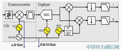 從圖 8 可明顯發(fā)現(xiàn),共享相同 LO 與 IF 取樣頻率的 2 組分析器,將維持穩(wěn)定的相位偏移。事實(shí)上,各組分析器之間的相位差 (圖 8 中的 ∆Θ = 71.2°) 均可進(jìn)行量測(cè)并補(bǔ)償之。若要補(bǔ)償各組分析器之間的相位差,則僅需于 DDC 中調(diào)整 NCO 的開始相位。若 NCO 所使用的 IF 中心頻率,即用于產(chǎn)生最后基頻 I 與 Q 訊號(hào),則此 NCO 本質(zhì)即為數(shù)字正弦波。在圖 8 中可發(fā)現(xiàn),以菊鏈 (Daisy-chained) 方式連接的 RF 分析器,可透過特定中心頻率產(chǎn)生 71.2° 的載波相位差。在整合了第二組 LO 的連接線長(zhǎng)度,與其所使用的中心頻率之后,即可決定確切的相位偏移。若將 71.2° 相位延遲 (Phase delay) 套用至主要 DDC 的 NCO 上,則可輕松調(diào)整 2 個(gè)信道的基頻訊號(hào)相位;如圖 9 所示。