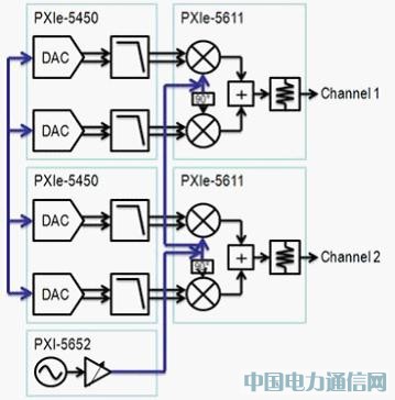 在圖 2 中可發(fā)現(xiàn) NI PXIe-5673 共包含 3 個(gè)模塊,分別為:PXI-5652 連續(xù)波合成器 (Synthesizer)、PXIe-5450 任意波形產(chǎn)生器,與 PXIe-5611 - RF 調(diào)變器。由于這些模塊可合并做為單信道的 RF 向量訊號(hào)產(chǎn)生器,因此亦可整合其他任意波形產(chǎn)生器 (AWG) 與 RF 升轉(zhuǎn)換器 (Upconverter),用于多信道的訊號(hào)產(chǎn)生應(yīng)用。在圖 2 中,共有 1 組標(biāo)準(zhǔn)的 PXIe-5673 (由 3 個(gè)模塊所構(gòu)成) 整合 1 組 NI PXIe-5673 MIMO 擴(kuò)充組合。而擴(kuò)充組合共容納了 1 組 AWG 與調(diào)變器,可建構(gòu)第二個(gè)訊號(hào)產(chǎn)生信道。