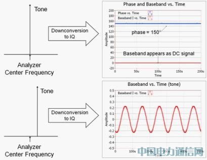 在了解相位同調(diào) RF 擷取系統(tǒng)的精確校準(zhǔn)方式之前,必須先了解應(yīng)如何于基頻觀察 RF 的訊號(hào)特性。此處以相同中心頻率,且以回送 (Loopback) 模式設(shè)定的 VSG 與VSA 為例。如圖 5 所示,具備精確分析器中心頻率的降轉(zhuǎn)換 RF 訊號(hào),將依基頻呈現(xiàn)為 DC 訊號(hào)。此外,由于基頻訊號(hào)屬于復(fù)雜波形,因此亦可將訊號(hào)的相位 (Θ) 分析而為時(shí)間函式。在圖 5 中可發(fā)現(xiàn),只要 RF 向量訊號(hào)產(chǎn)生器與分析器互為同相 (In-phase),則「Phase vs. time」波形將呈現(xiàn)穩(wěn)定的相位偏移 (Phase offset)。